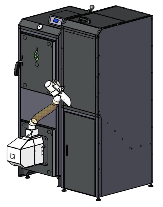 - опционально котел может комплектоваться пеллетной горелкой KIPI с автоматической очисткой для сжигания древесных гранул-пеллет, а также агро-пеллет (например, пеллета из рапсовой соломы или шелухи подсолнечника) размером 6-8 мм в полностью автоматическом режиме;
