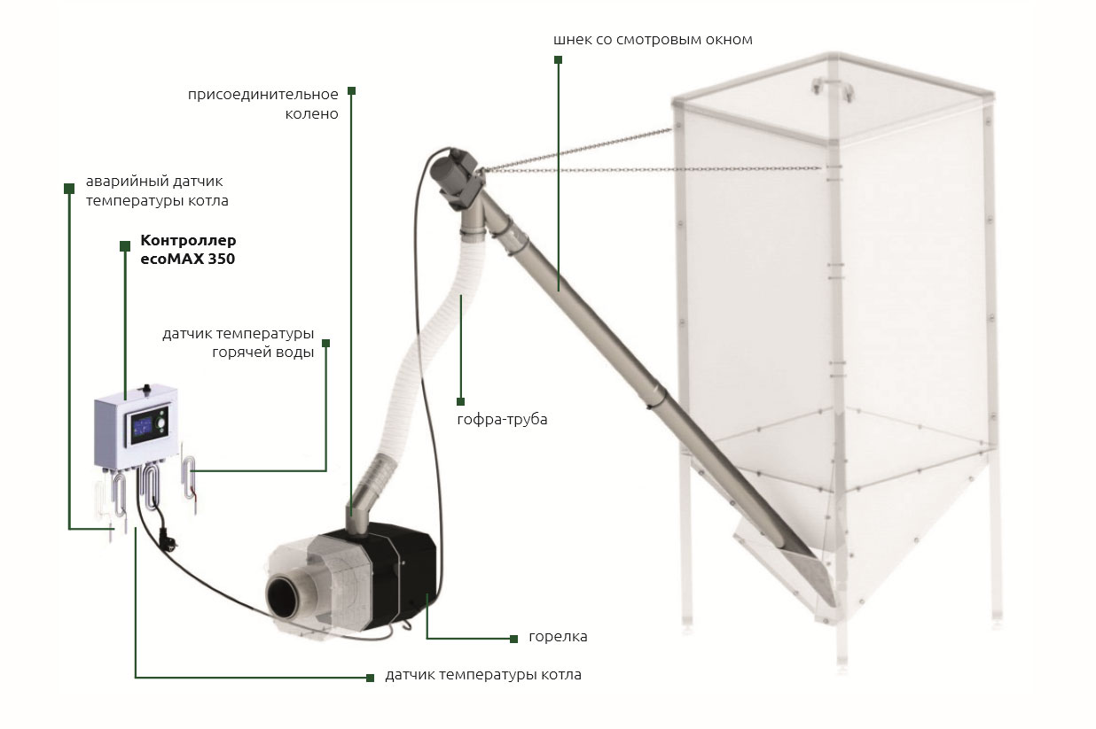 - Простота и универсальность: всего несколько минут и ваш котёл уже работает на пеллетах, установка в большинстве случаев производится в дверку котла;